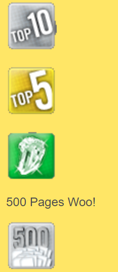 Another thing before I move on is as I mentioned in the past, the site hands out milestone announcements and cool looking badges you can attach to your profile. Like these which you can get for 1 page, 100, 500 and 1000. I don't have the 1000 one yet apologies I can't show it right now x'D.