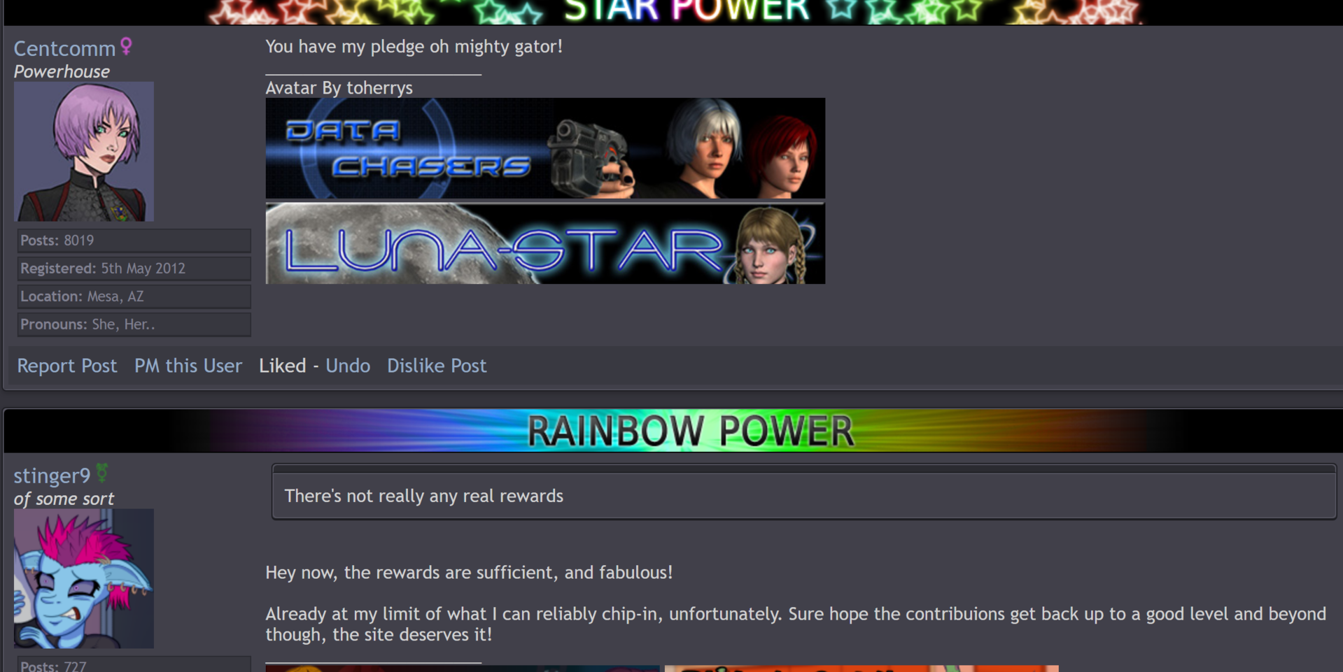 You can also get one for Featured (The green trophy). Being top 10 or Top 5 on the front page, but interestingly.. There's no badge for being number 1 in the rankings section. If you'd like to give the site a try and try and earn some badges. Kawai is the one you contact for the badges as she runs the announcements section. I briefly talked about Milestone announcements in the past thread. They are genuinely excellent and more creators on the site have been following my example of asking for them. Which they should! And dang it you should too!