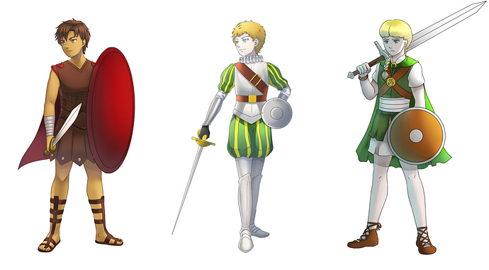 So I have a fighting game I'm working on called Child Arms. I have a roster of 10 characters but only 4 of them actually have some armor. Well, the third shown one is a bit of a stretch though as she mainly has clothing tied with a belt, but technically she has chain mail underneath her clothing, which is probably the only underwear she has, lol.