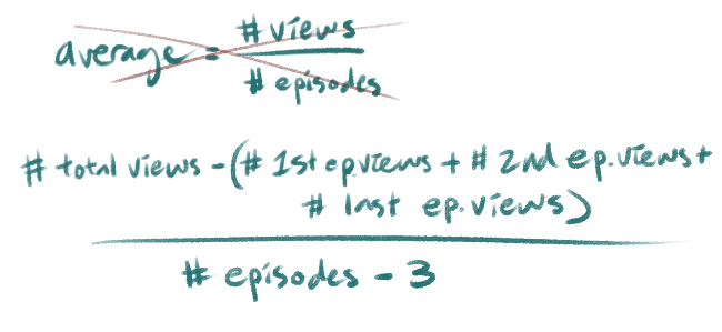 This was a difficult one because it's difficult to find an accurate average of views per episode, especially when they keep fluctuating, so I removed the first, second, and last episode from the average
