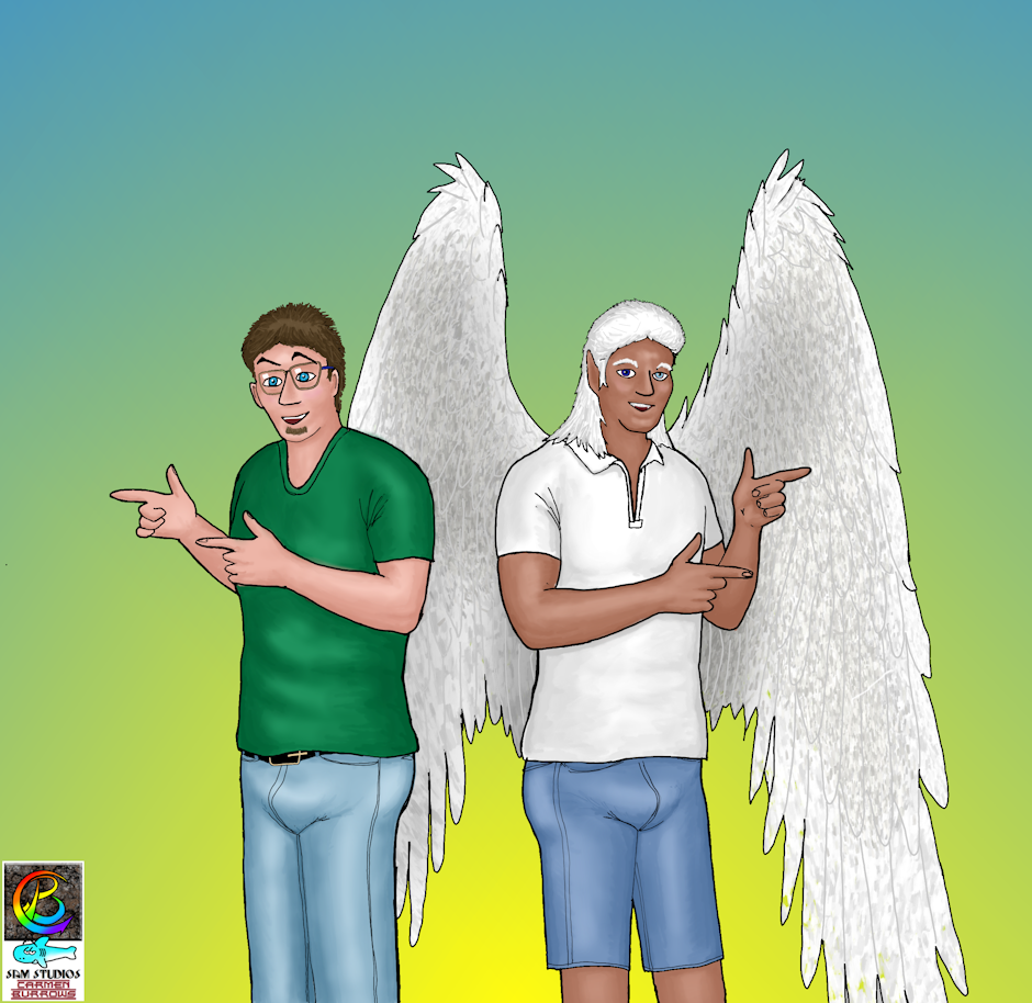 The dude with the wings is Daecon, the main protagonist in Finding Daecon's Way. He's a shapeshifter, though he only just found this out yesterday.