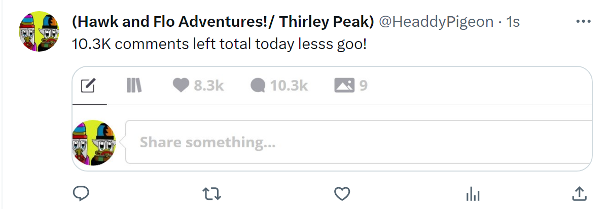 I post stuff like this on my Twitter and my Bluesky every now and then. (or at least when the number goes up lol). Tapas is a very community driven website, it tells you plain as day how many comments a creator has left which is an incredible feature for someone like me as it meant I didn't have to keep track of it all in my head xD. Lots of creators struggle for reader retention, partly due to the sub for sub culture that the forums promotes. Lots of comics get 1000 subs, hit the front page but will struggle to get 5 comments on just chapter 1. One thing I actually do Is I go through the featured section on Duck and Tapas and type congrats on the feature and try to be supportive of people who are having their moment. It takes about 30 minutes to do admittedly if I go through just one section like 'completed works' or 'staff picks' here on Tapas. I do it and if the person replies i'll try and have a conversation with them.