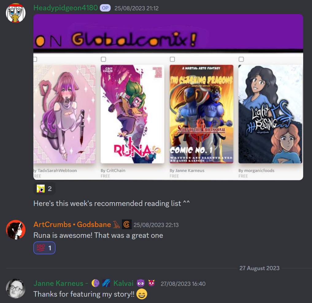 That being said I was able to get Global to work for me, I socialised with the owners of the site, I have my own recommended reading section in the discord and a promotion section for my own comics. When I post recommended reading lists I can often get into some nice and friendly conversations