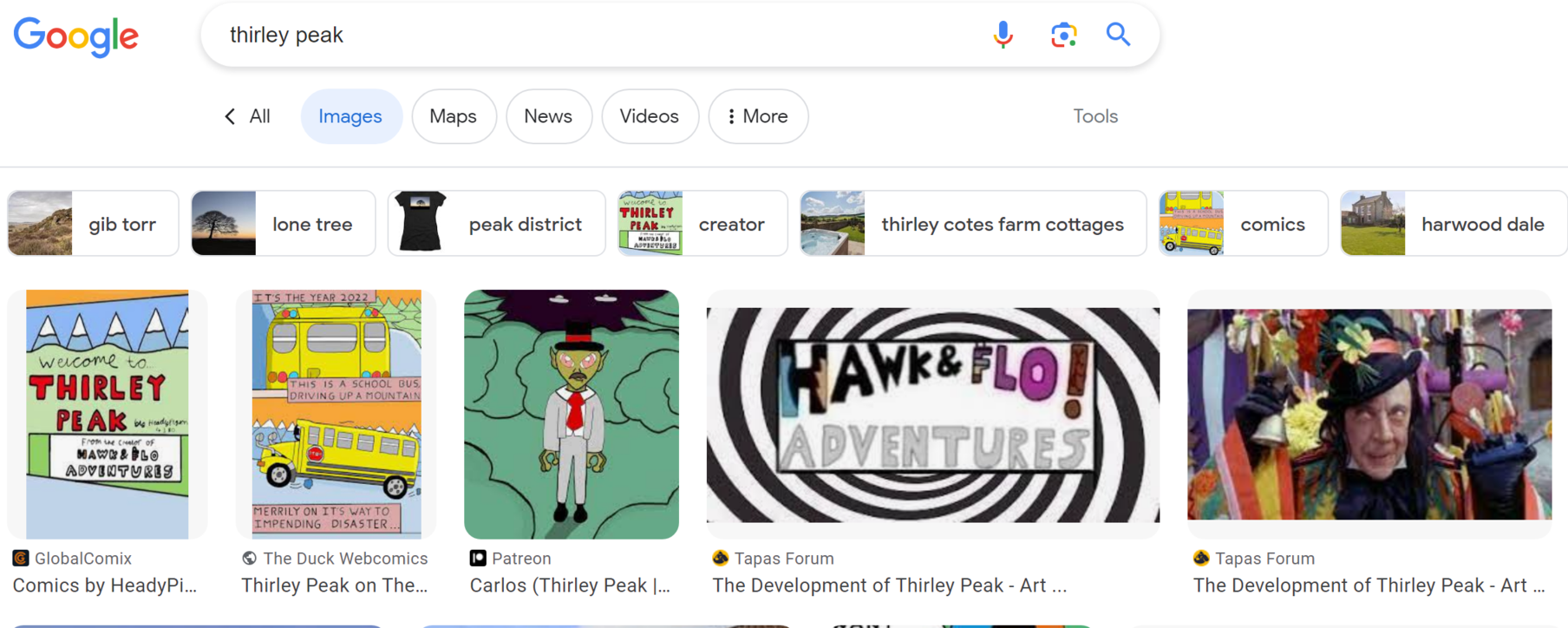 The 5th result is an image from a thread I made talking about the creation of Thirley Peak. One thing that's really great about the Tapas forums is that they come up in Google searches quite easily. One main method of getting eyes on your comic is to optimise your search results as best as you can. Unique names for series are very good for this, as are Duck webcomics community blogs among other things. There are many more things to try out to help improve your visibility, the 2nd biggest source of readers I have for my comic come from Google itself.