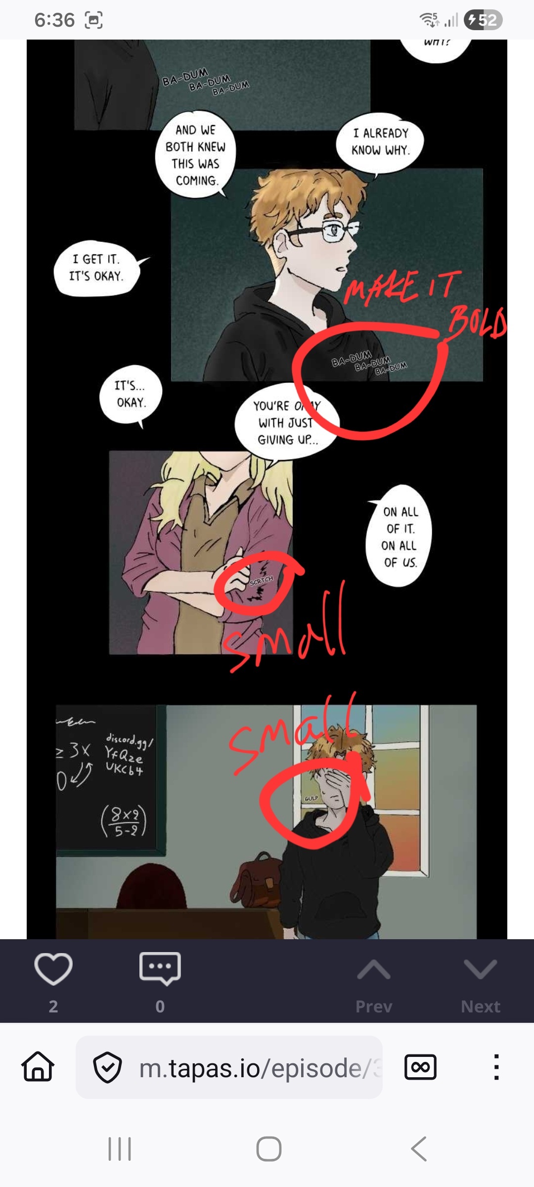 Aside from that it's probably just a little bit hard to see the sfx. It's good to make it bigger and bolder, or even in different fonts and color. I'm using phone to read this so I don't even see the bottom 'glup' until I zoom in. Small sfx wasn't Always bad, so always see the circumstances of wether it's needed or not! Always try to experiment with the sfx lettering, they can be fun sometimes.