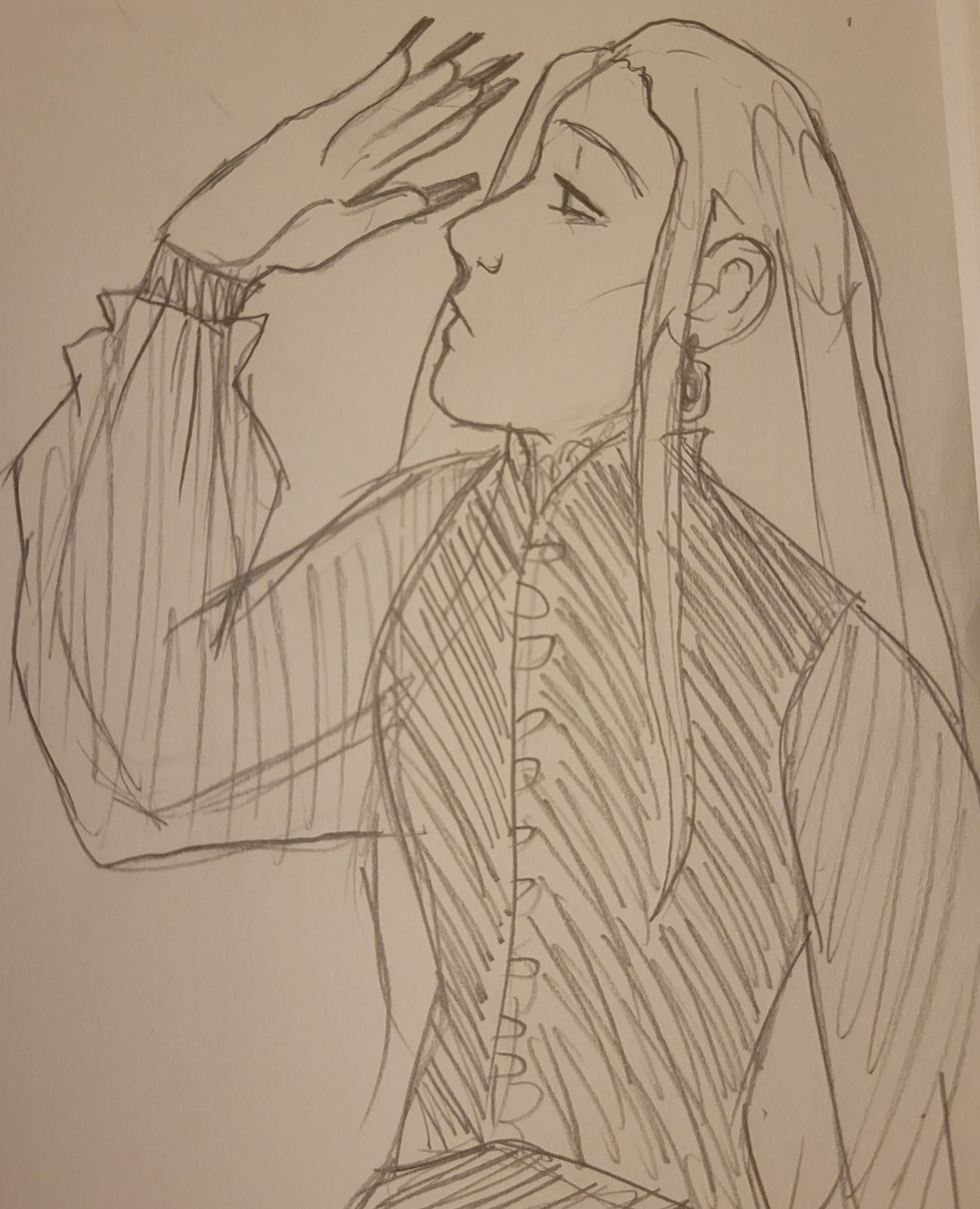 I mostly don't fix my traditional art, but I can see some bad parts: the drape shadows on his shirt, & both elbows could've drawn a bit better. Haven't mastered the brush-tip fineliner so it looks like someone else's inking