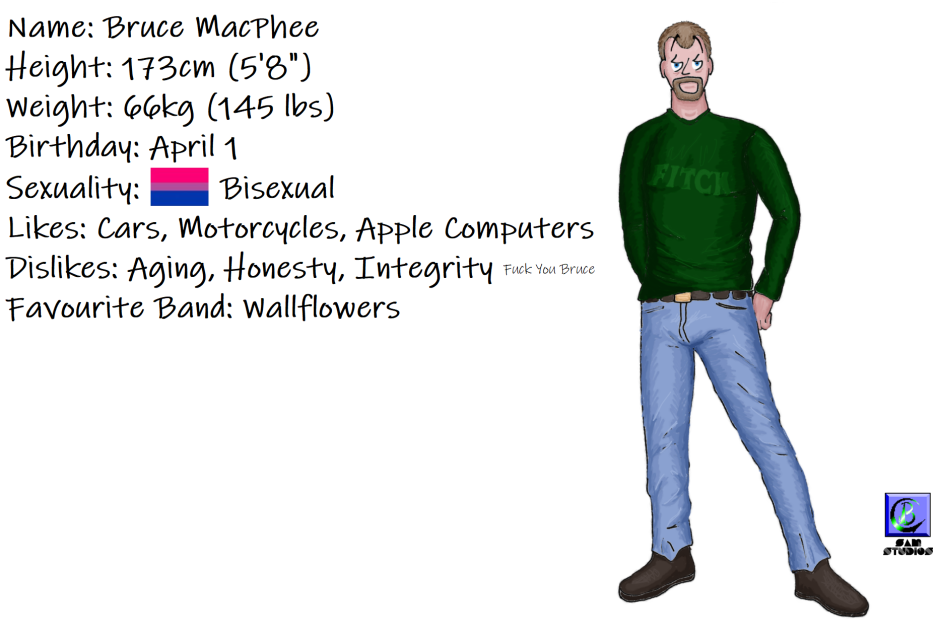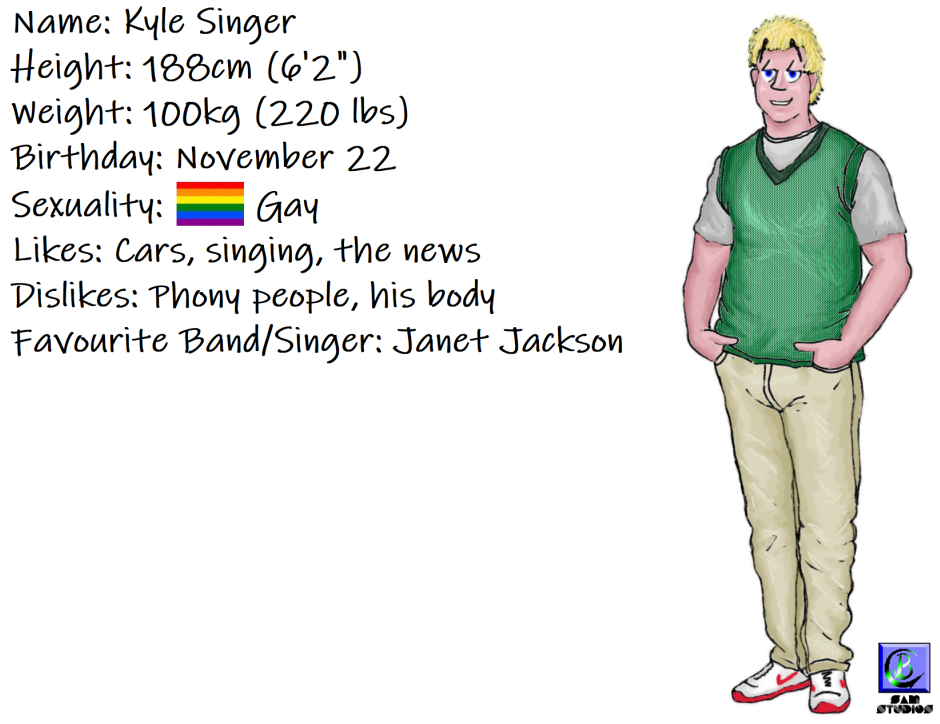Devin was Kyle's boyfriend, if you could even call it that. He was using Kyle for his money and cars. He was a piece of shit, and he would end up having a big impact on my relationship with Bruce. I dislike him so much, not just for what he did with Bruce but for the way he treated Kyle, that even though I've never been happy with this drawing (his tiddies are too big and too low) I won't redo it because he isn't worth it.