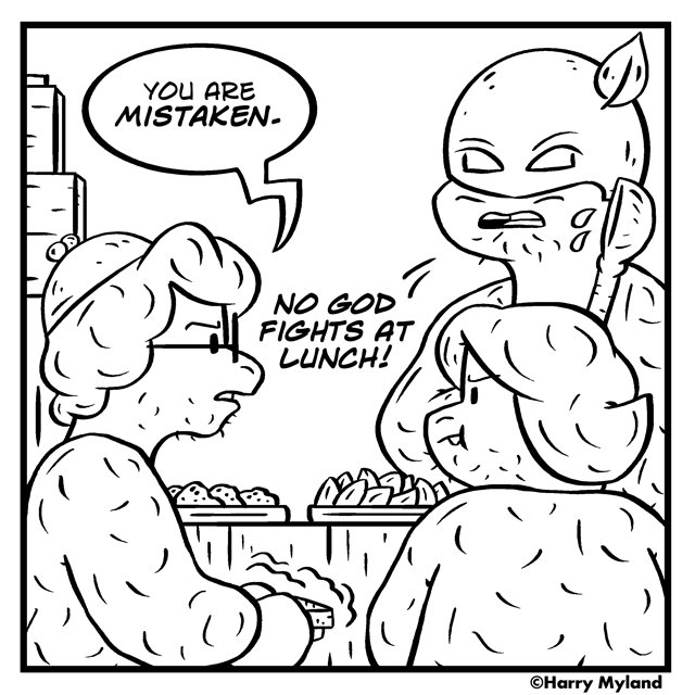 This is a bit of a world-building story with the introduction of GOD! Well, GOD+S!! They're all basically kaijus, but I liked the idea that there were a bunch of little sects in this community as opposed to them all worshiping the same thing. The gods are all part of the same story, but their individuality introduces a bit of team-sports to the proceedings, which I think makes religion a little more fun.