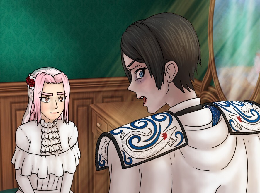 Alex on the right dominating the screen space(In the final version, I also place the text bubble right over Corrine's head, thus making it appears as if she's completely boxed in by Alex.)