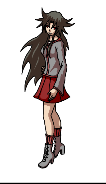 Color scheme = black because she's obviously evil. Little bit of red because red is the color of blood. And she's bloodthirsty being a devil and all that..