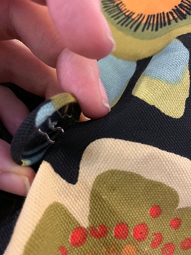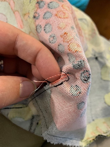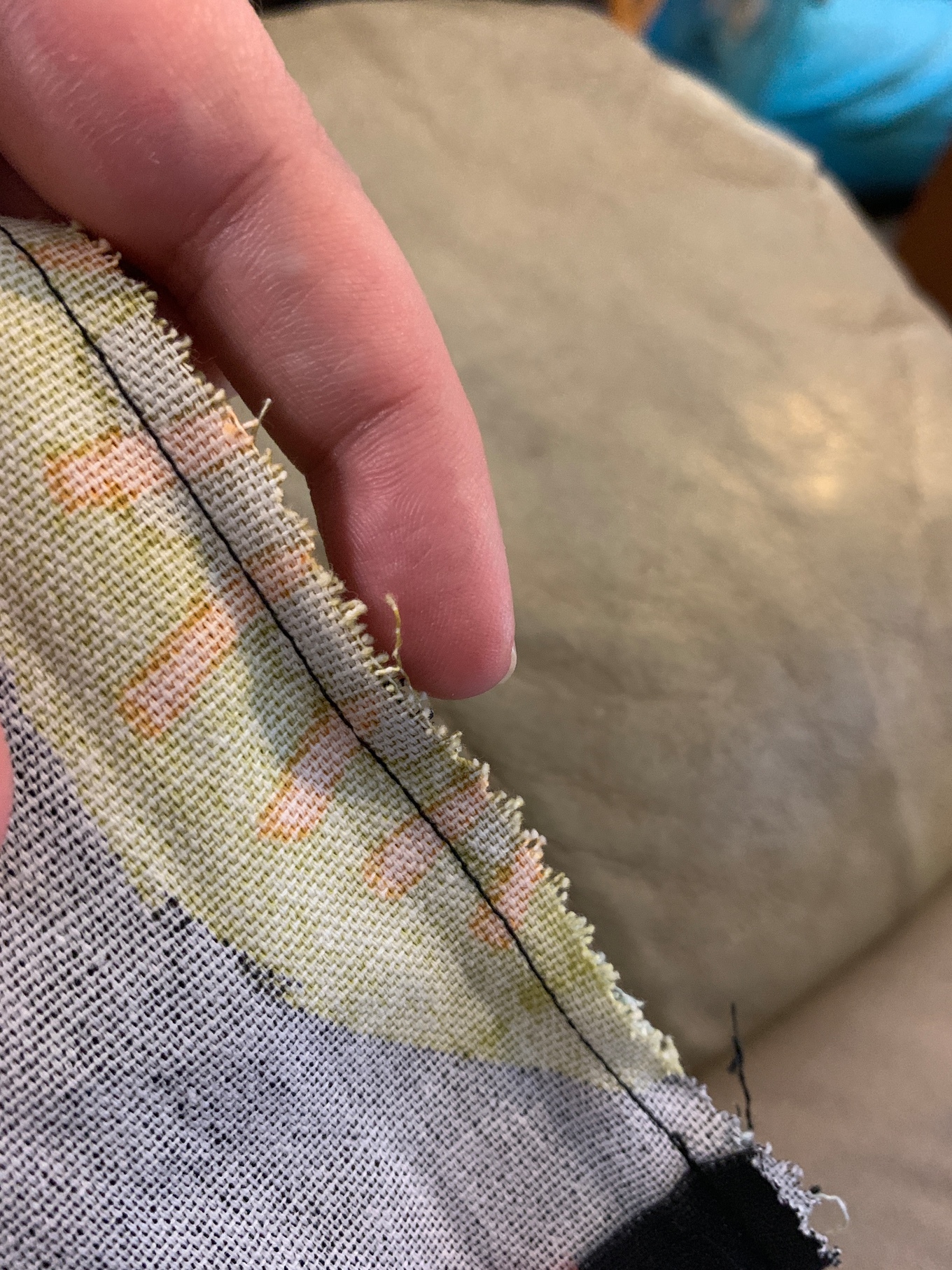 Its a basic seam when it needs a surfer or bias tape. But the bias tape would only be 1/4 of an inch wide to make it work and that's very hard for a beginner. It's give this about 5 washes before we have issues. Also because of the TYPE of fabric, it really needs iron on fabric interfacing to make it stand up well. There is fabric I can get, but it costs more and I can only charge $20 per child for class fee. Going to the little loop... the main problem there is the size. It starts off at an inch wide.