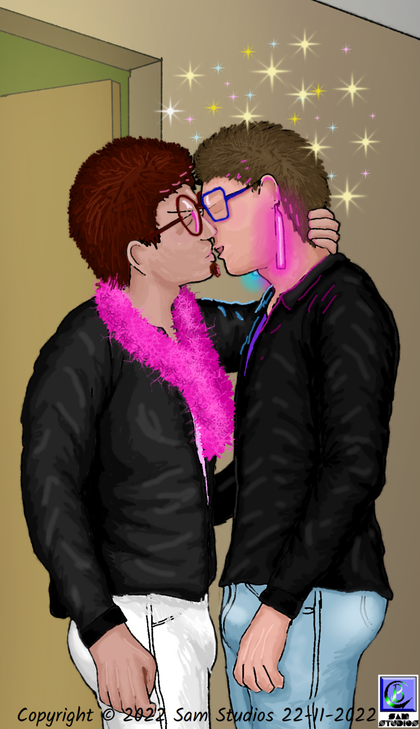 Carmen and his boyfriend Troy share a kiss on New Year's Eve 1999 (actually, this kiss happened at 1AM on Jan 1, 2000 - it's a complicated thing, but it's all in the book!) while Rodney (Carmen's straight friend, also shown in the pic with the bicycle above), Darryl, Don, and Mel cheer them on: