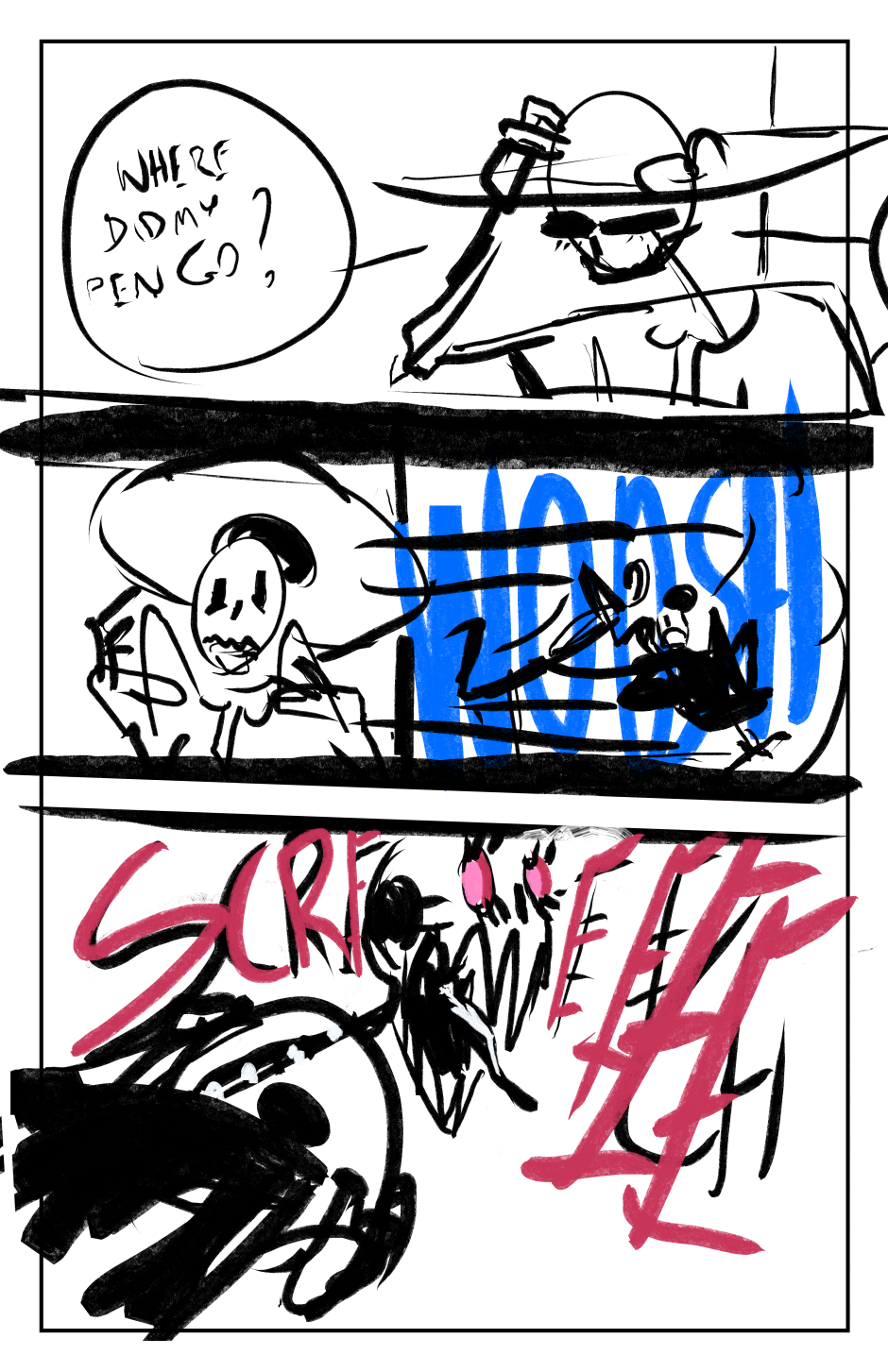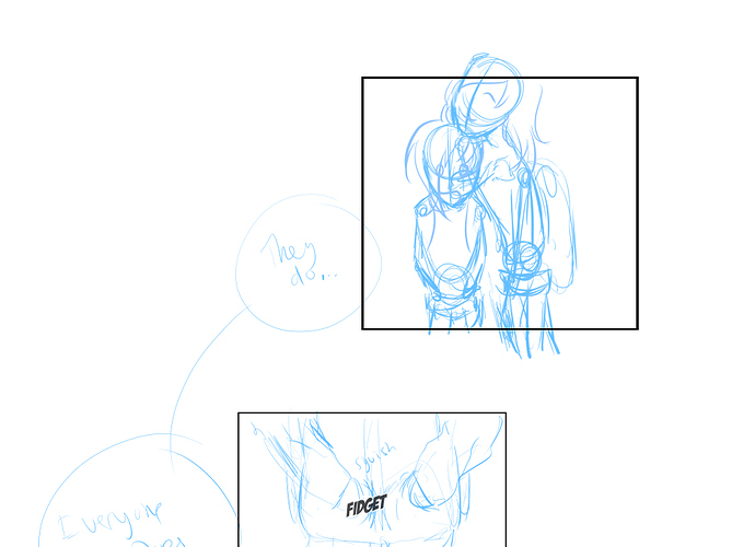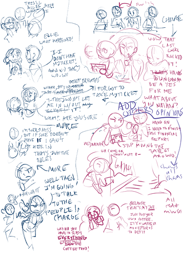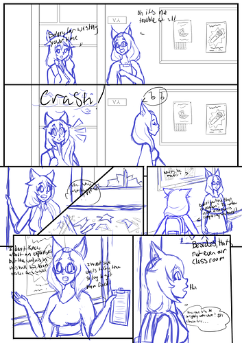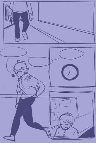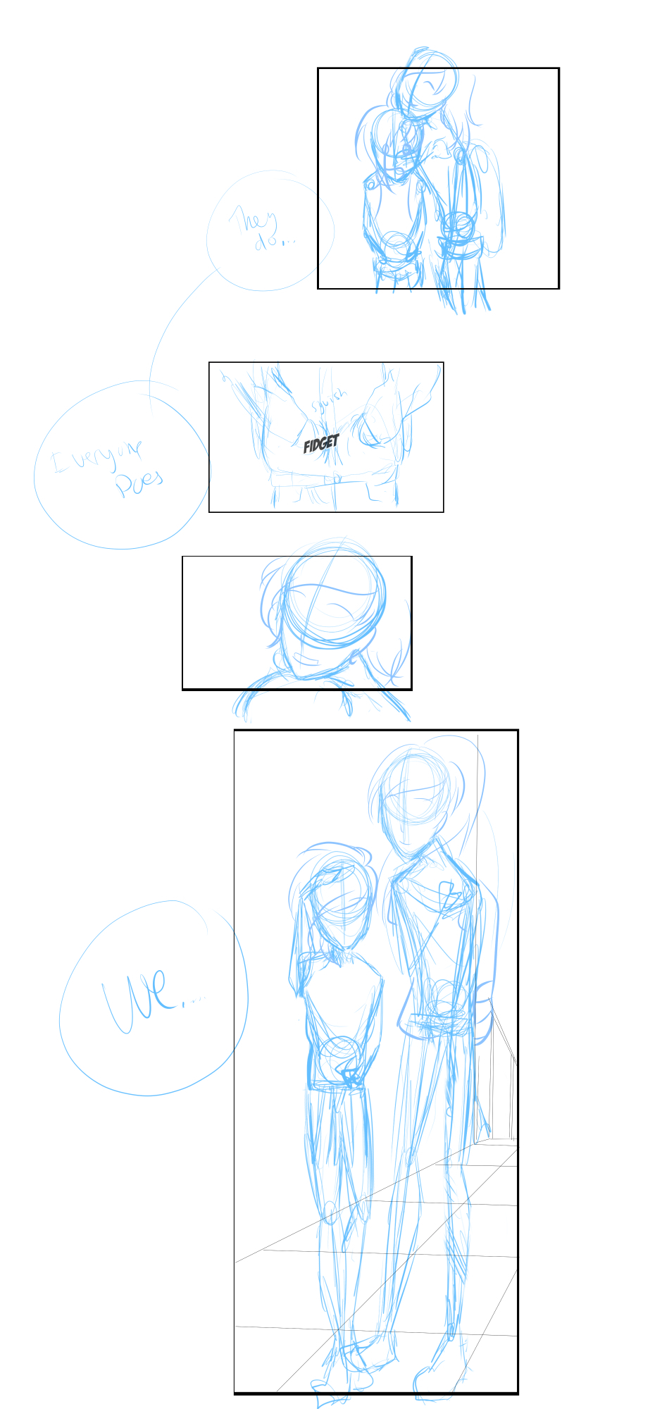 Below is the first outline which gives me the general idea of what I might want to do for this page. I don't worry too much about proportions. After this stage, I will outline everything again, but this time I will make sure people actually look like people with appropriate (at least to the best of my abilities) proportions. Unfortunatly, I don't have this version saved as I usually delete this layer once my line art is done.