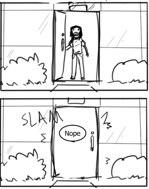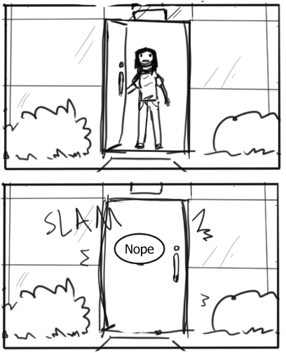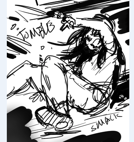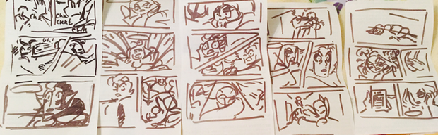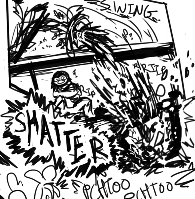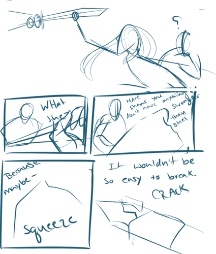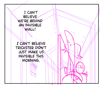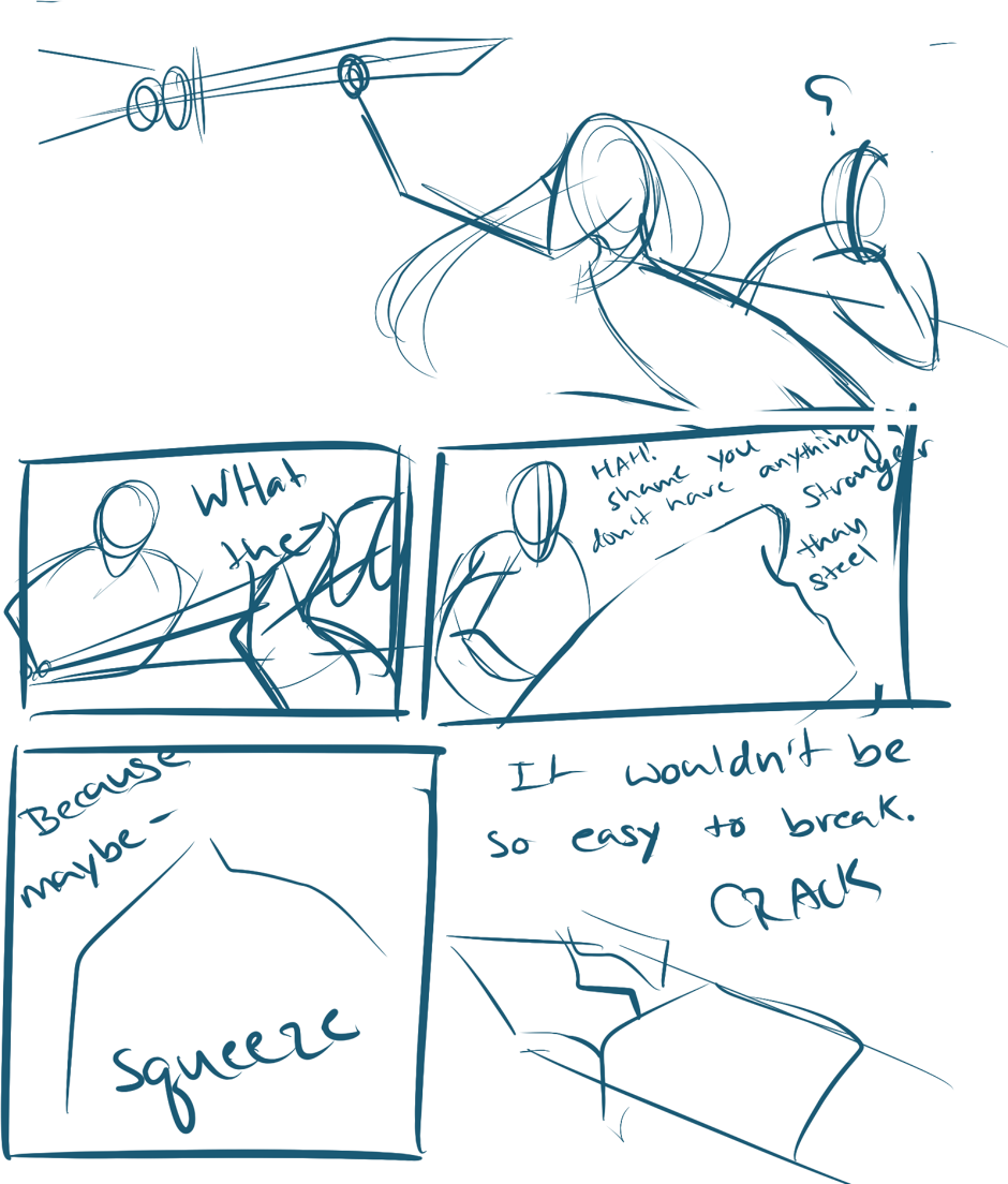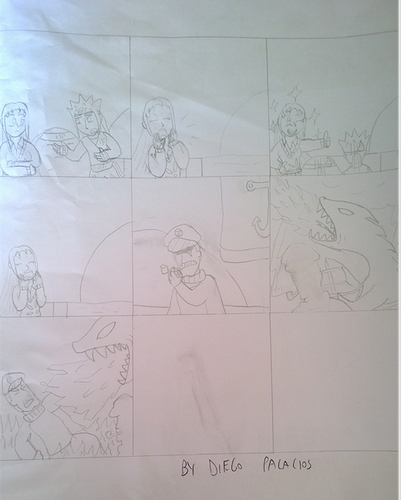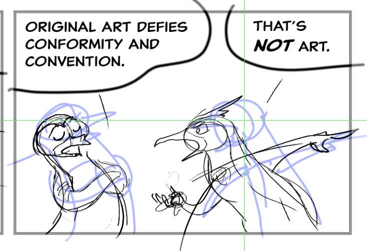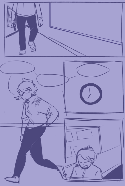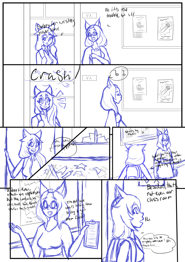 Below is the first outline which gives me the general idea of what I might want to do for this page. I don't worry too much about proportions. After this stage, I will outline everything again, but this time I will make sure people actually look like people with appropriate (at least to the best of my abilities) proportions. Unfortunatly, I don't have this version saved as I usually delete this layer once my line art is done.
