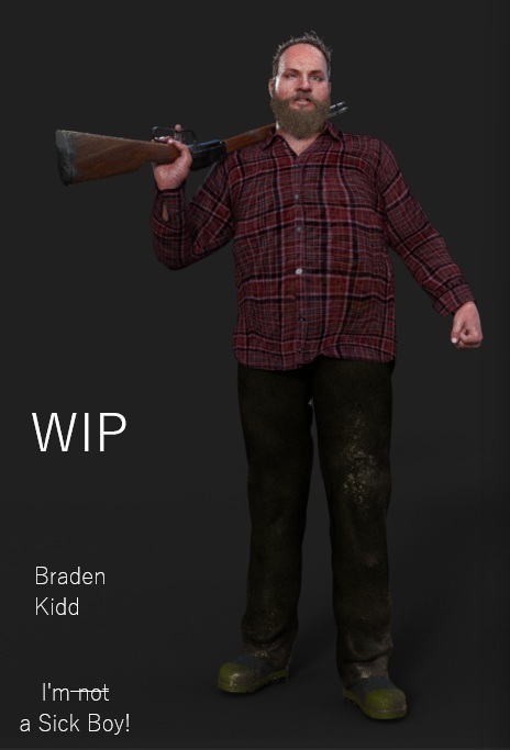 He's still a WIP - still tinkering with the beard and have to fix the texture and maybe uvs on his shirt (notice the terrible wobbly plaid), he's suppposed to show up a few episodes from now alongside his daughter Quest and nephew Quim.