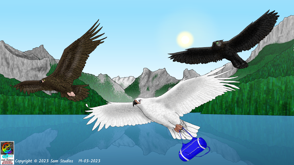 My characters can also take on bird forms. Here are Daecon (white Royal Eagle) and Evander (Osprey) flirting and flying: