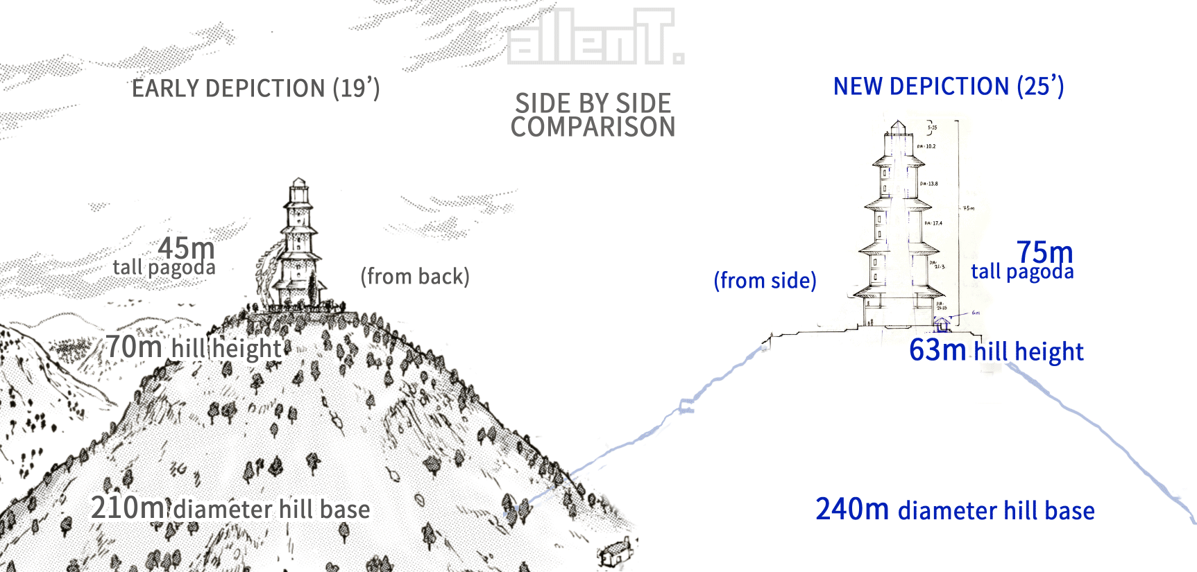A comparison.This is more about the whole feel of the pagoda in relation with the lump hill. (The old one is more pleasing to look at but unrealistic for pagoda with that size, there should be enough space for rooms and ladders!)