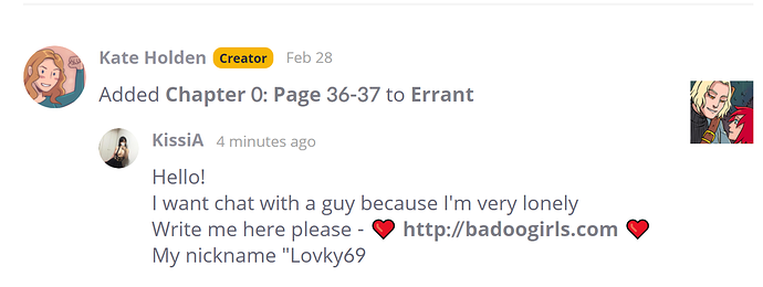 "I am a random stranger on the internet who wants to fuck you for no reason, and it makes perfect sense for an impossibly sexy woman like me to be looking for dick on a comic sharing website for gay teenagers. Because isn't that where all horny women go?"