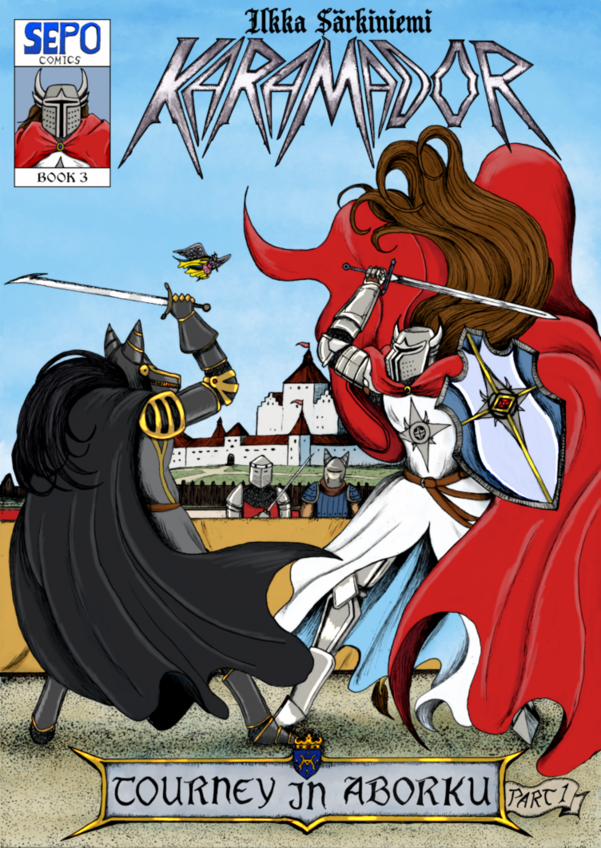 Greetings! Here's my comic Karamador, which is a medeival- and reneissance fantasy series, set in a world called Karamador, inhabited by humans and human-like animals and insects known as anhinis.