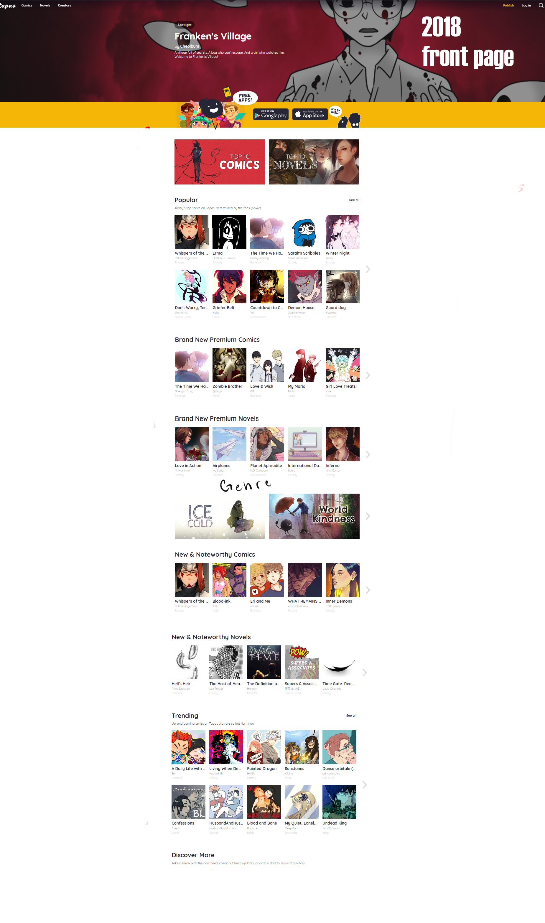 "man, I'm used to this, It showcases a bunch of comics, including the free ones!" but, I think this is quite part of the problem, especially when you compare this layout to webtoons, or the obvious Lezhin influence. The problem here is that Tapas wants to be able to both show the community (free) comics and the premium (paid) ones at the same time, without much foresite on how a new reader will just stay on to top page and only pay attention to the top of the page, this is possibly why people outside the site aren't even aware that free-to-read comics/novels exist on this site! The fact that you even need a community tab is insane to me.