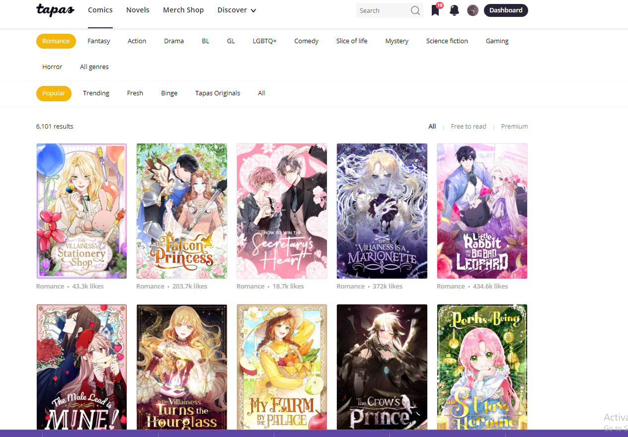 tapas's weird layout has effected the visibility of many comics here, I'll show another example, this time inside the comics tab, in the romance section (this is the automatic tab you see in the modern site)