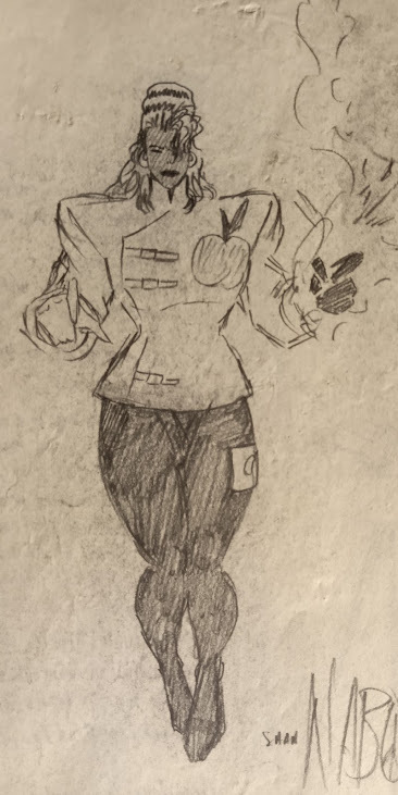 All of my earliest stuffs fall into two categories: art from when I was little- that is [probably] now stored away in a storage that my oldest sibling has and hasnt cleaned/maintained it in a WHILE, and old [teen] comic art that I lost moving around over the years and sent to a friend(that has now lost it)...I have a few pieces left, which most are in my storage- and a few character sheets that I have with me(that I've been updating the looks to)...