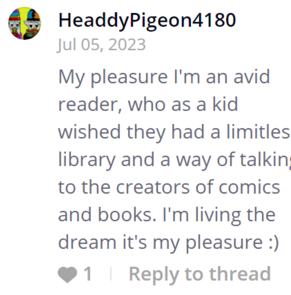 A comic creator who is slowly turning into an addicted reader. Yes There's so much stuff I love reading on here i'm finding it hard to stop, I'm in heaven and this most recent comment I left another comic I feel sums up why i'm an Avid commenter