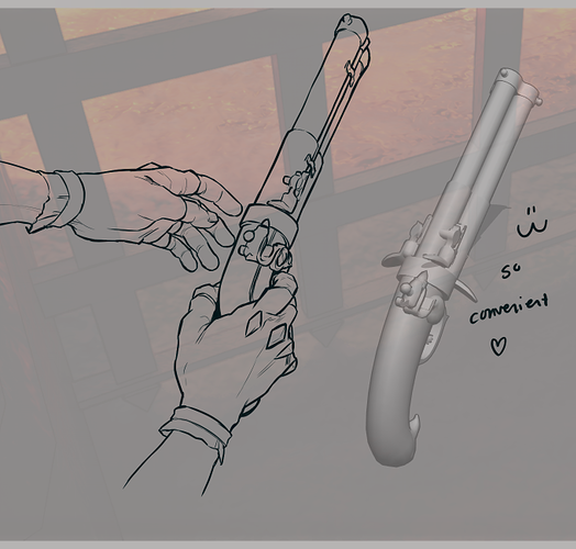 I was able to buy a 3d model that's really close to what I wanted for Liv's gun and import it into Clip Studio using the modeler. It's really fast/easy - might look into it further to see if I can get it with more textures and change the model so it matches what I wanted exactly. In love already though - it's not too fussy to rotate it and draw this object so much faster than I would if I was trying to imagine it