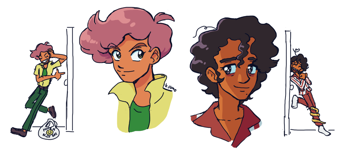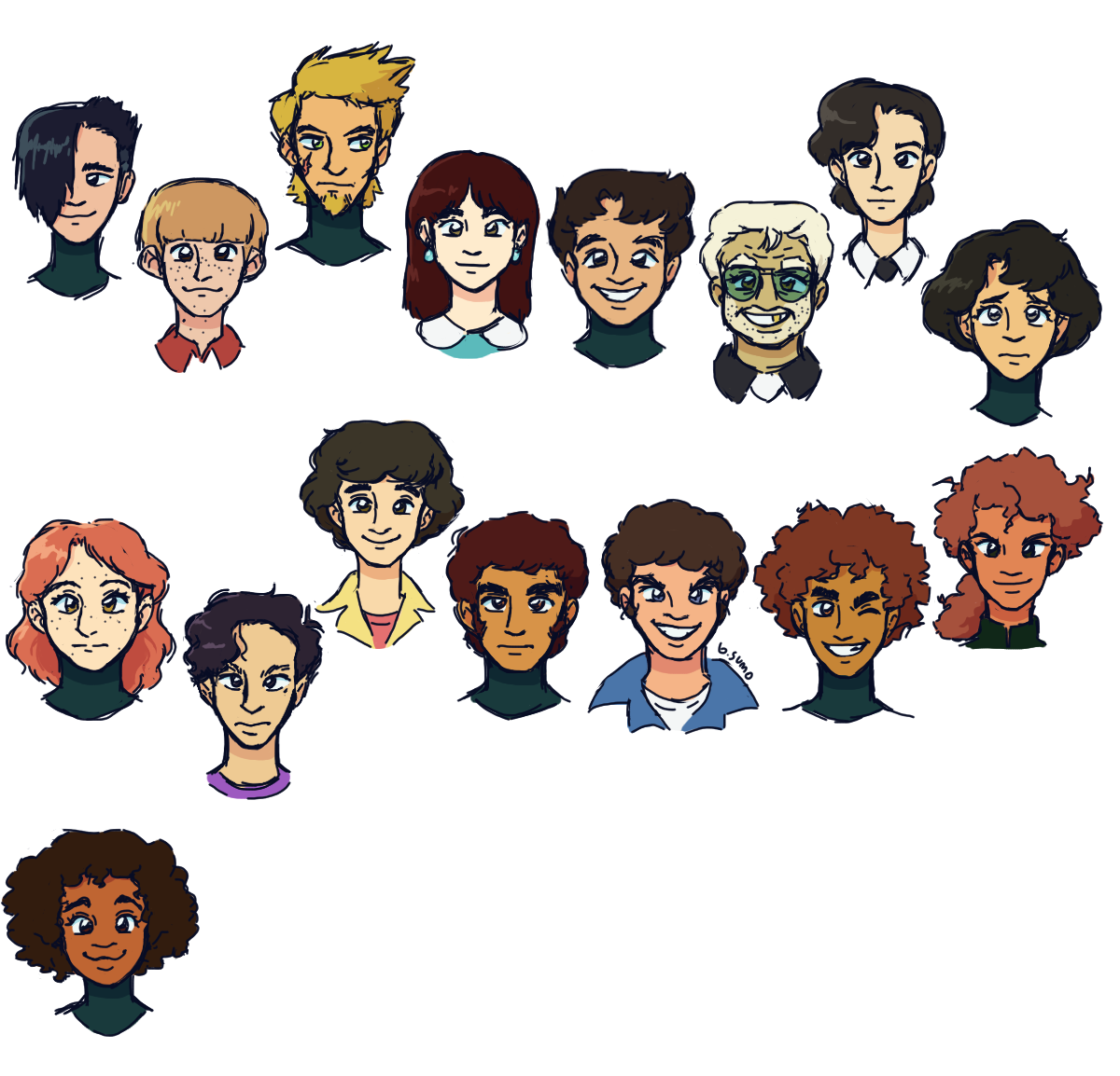 On a whim, I decided to sketch my characters' natural hair textures from straightest to least straight. Slightly more realistic style than usual.