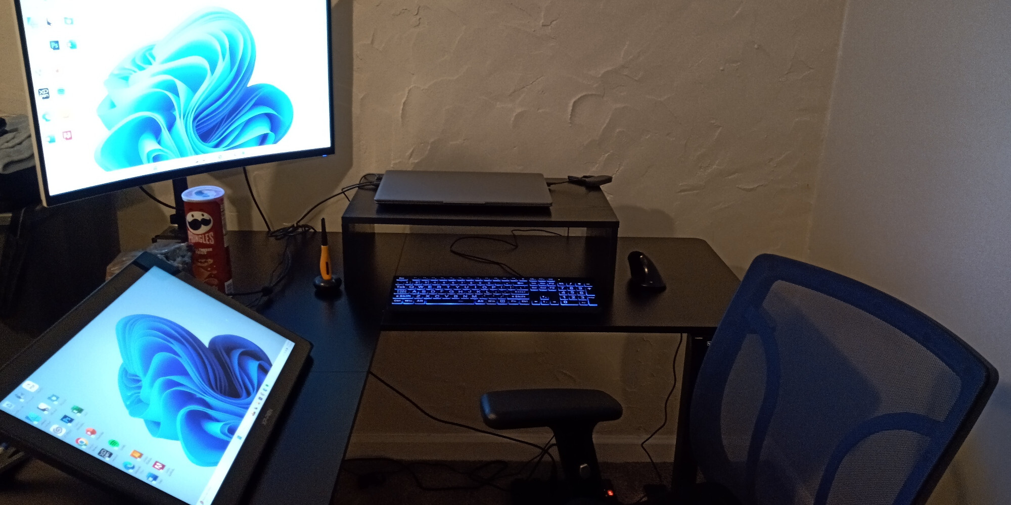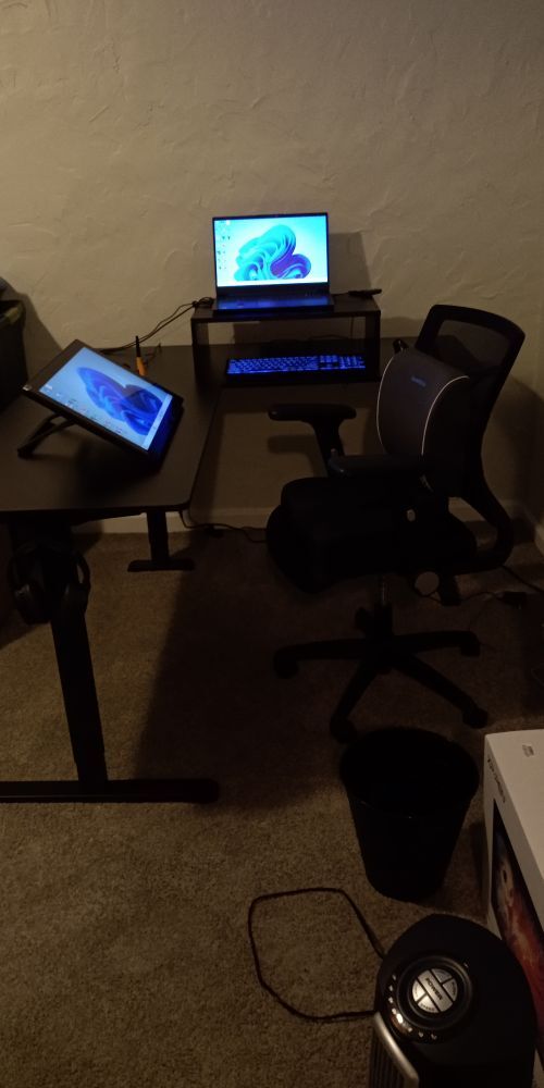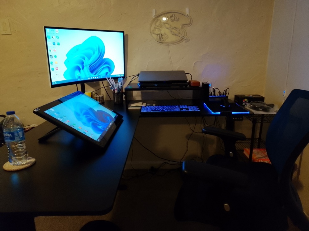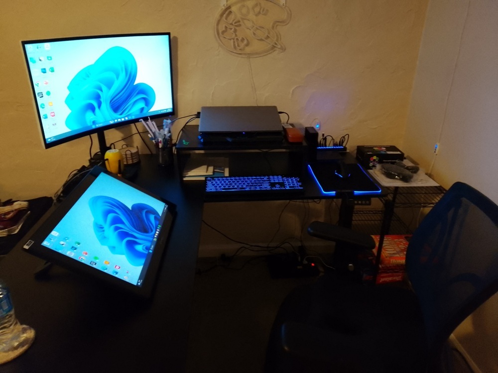 Got the desk station set up(mostly); got an LED glowy mouse pad & a clamp power outlet for the desk since I had a few items that the cords will not reach the super power strip(like my cup warmer)...I even hung up the LED hexagon lights and the art palette light- though I do need to reposition the latter. Currently waiting on the floor desk pad, coz we have carpet and it's making my chair hell to move.