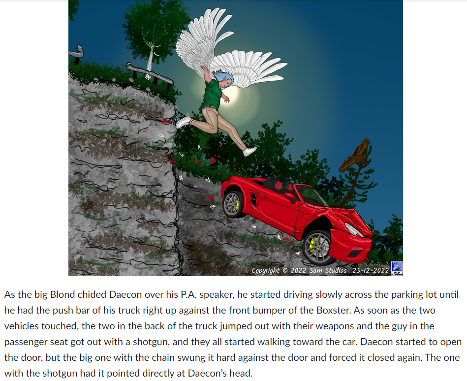 A preview of the second chapter of Finding Daecon's Way. This is an illustrated webnovel, so all chapters follow this format (an original drawing and some text). Please forgive the wonky text formatting, this forum diddled with the image sizes when I uploaded 'em here. In the actual novel it's more uniform: