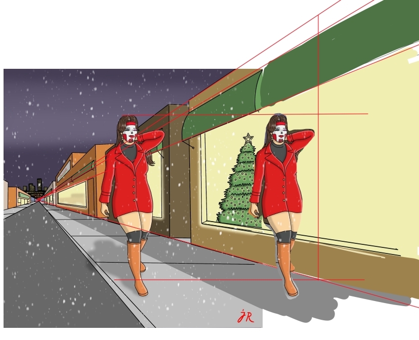 So I suggest raising the vanishing point higher to create a more natural adult eye-level view coming face-to-face.