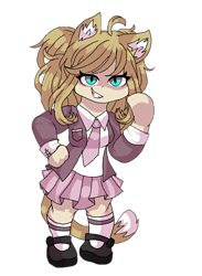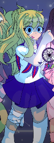 Long blonde hair in braid, brown eyes, pale skin, curvy body, prosthetic left leg, birthmark under her left eye. Wears a blue skirt, white blouse and brown cardigan.