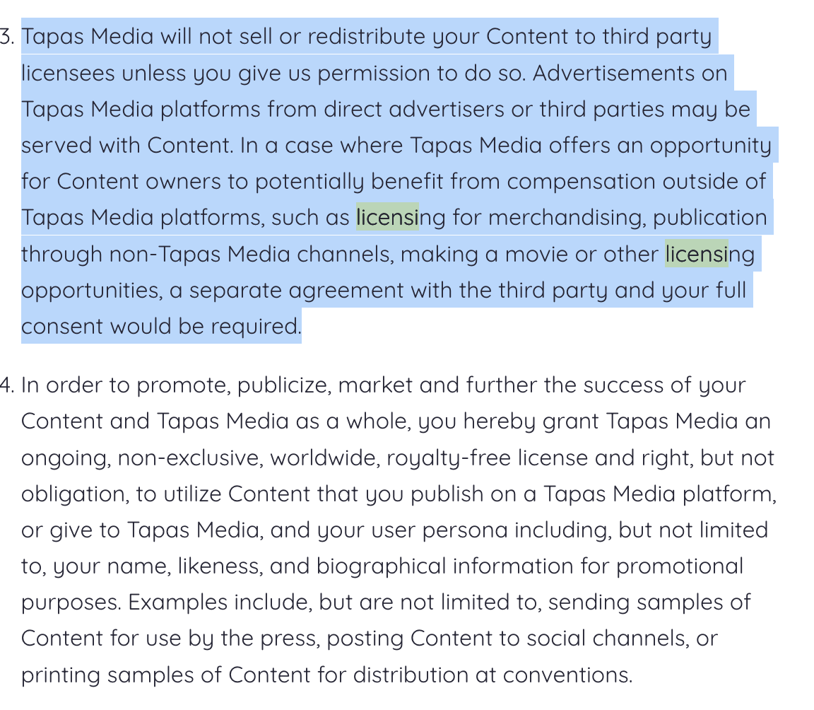 Tapas agreement is even more specific to how the licensing with them works. They specify that the license is only for promotion. It's not a total catch all like webtoon.
