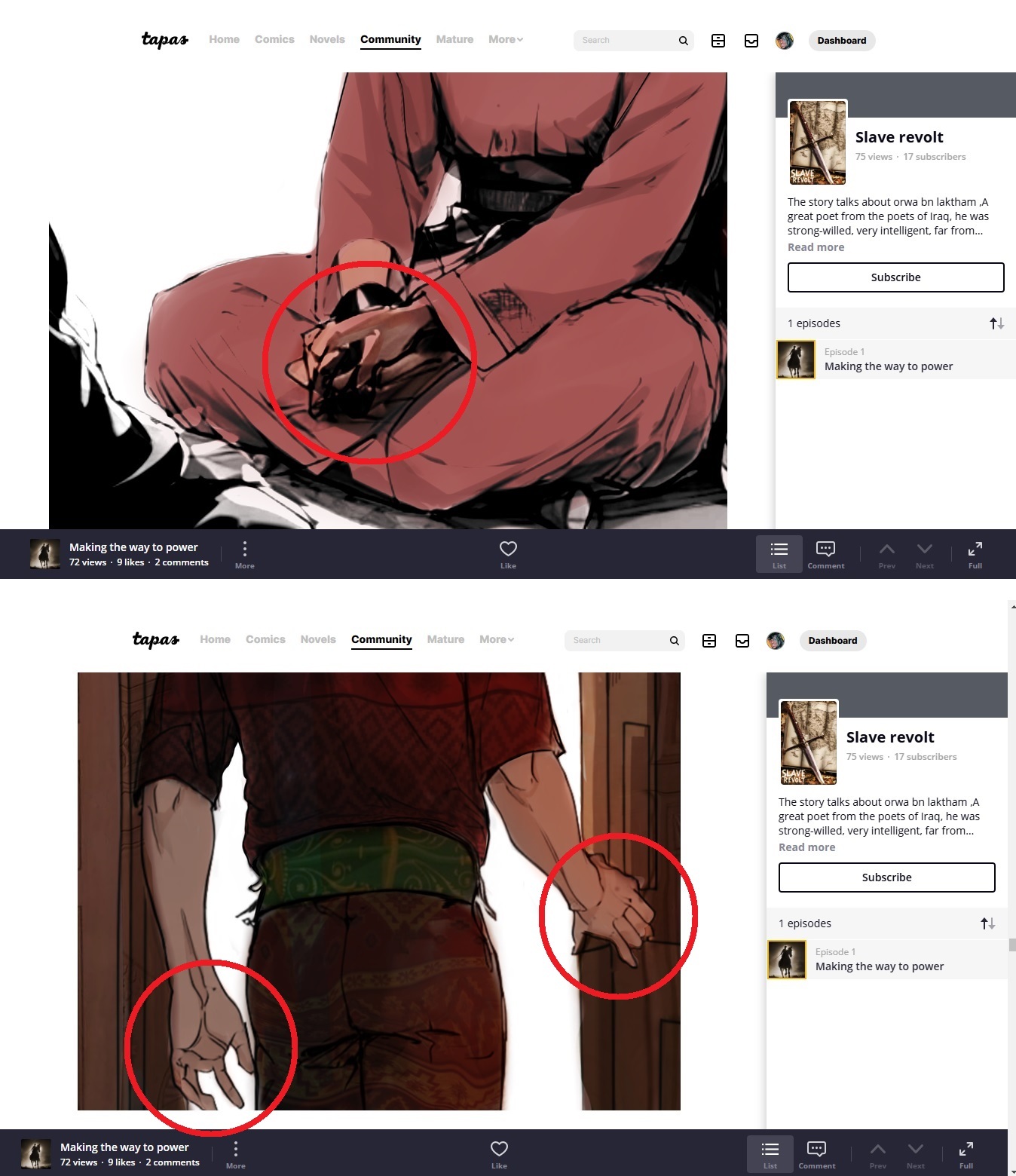 You have trouble with drawing hands or are using some kind of AI generator. Just so you know, Tapas does not allow AI art on the site.