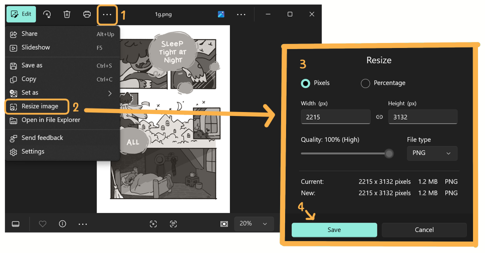 Here are screenshots for resizing images on the computer for Windows, if that helps. It could be similar for other operating systems (Apple IOS) or devices (tablets), but I would not know.