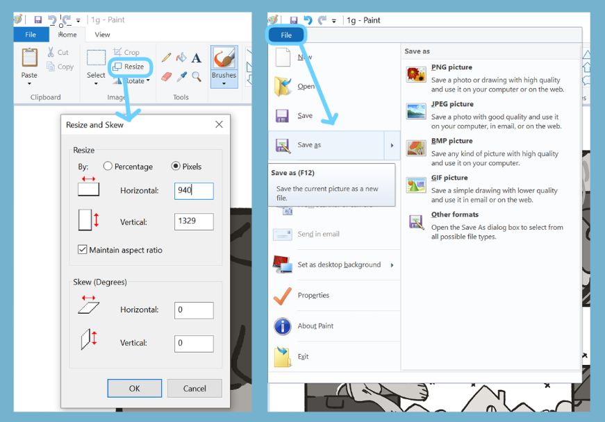 (3) Adjust settings in pop-up window. Resize > by pixels, width = 940 px, Quality: 100% High, File type: PNG or other