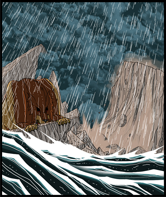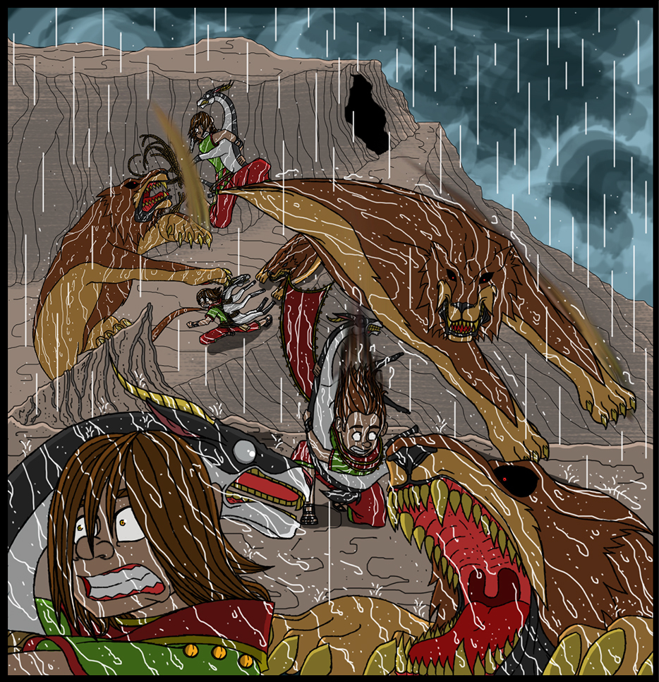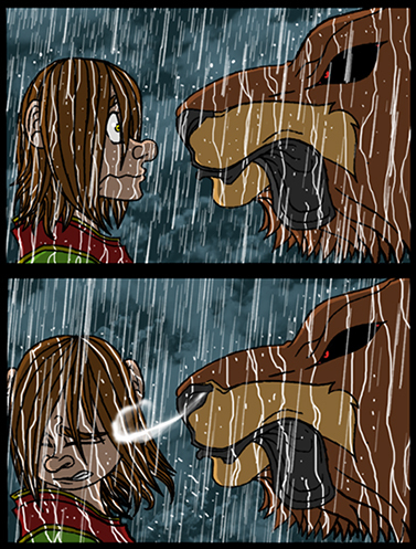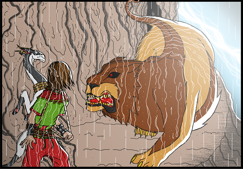 And even though it tried to eat him, he could not stand seeing the Hippo Lion die as the rain drops so fast the lion is going to drown, so he saved it and the lion surprisingly spare the kid: