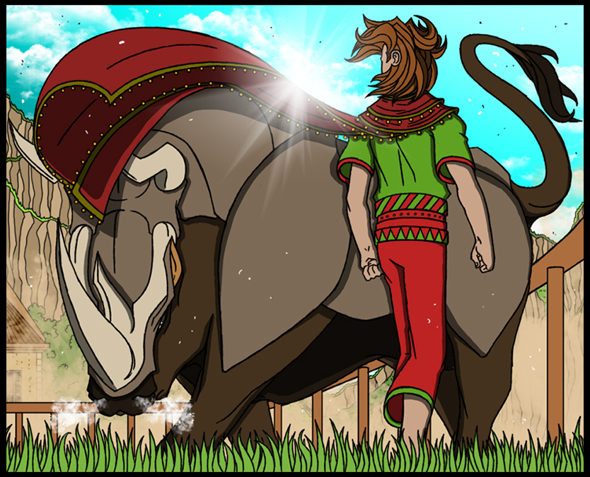 Now this is one of his deeds, and currently he took a risk to face and tame a Rhinbull in exchange for the freedom of a slaved Haran which is a humanoid rabbit: