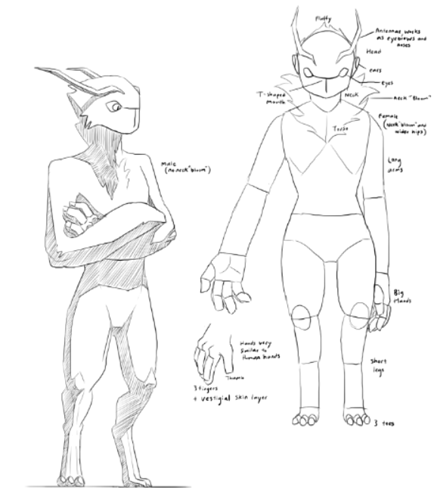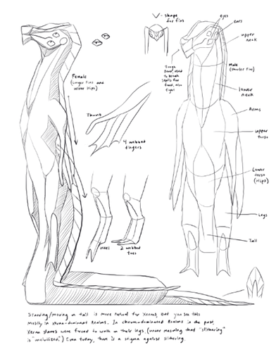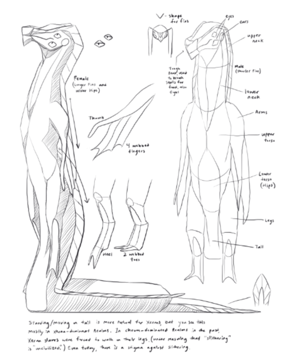 The Xerans are the most alien of the three, having serpentine bodies and limbs more akin to fins. That's because they evolved from the oceans. They would seem fragile on the surface; arms and legs that lack strength, and skin susceptible to drying under heat and wind. But their spirits are said to be the strongest of all. Today, they are working hard to achieve equal standing with the Chevans in Mylur's social hierarchy, through their foundations of culture, creativity, and community.