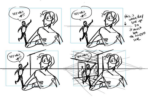 using this information to roughly figure out perspective in a scene -- once you add some more figures, you get a feeling of 3-D space, and it becomes easier to kinda guess where background elements would be. you just draw out those lines until you see where they run into your horizon line, and you can make a basic perspective grid that fits with all the figures in the scene: