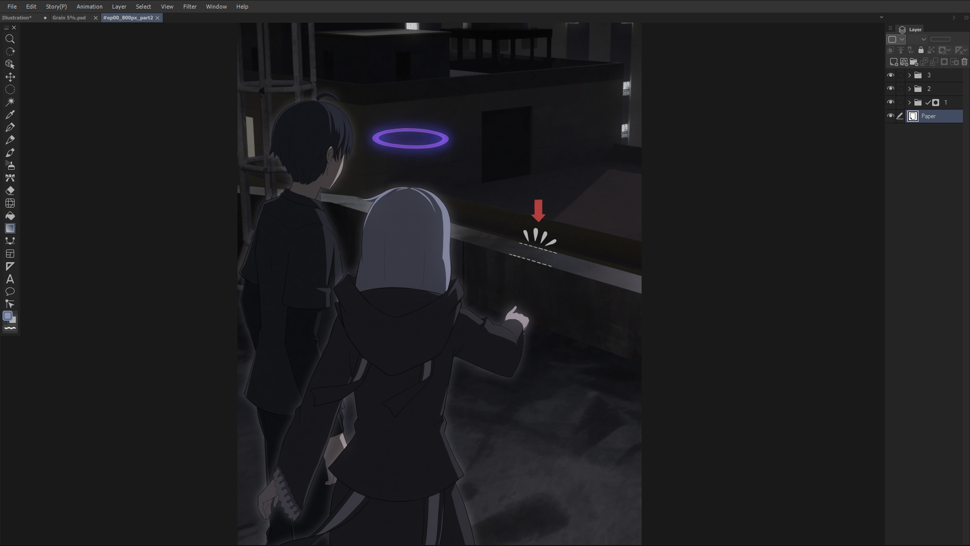 I use mostly Photoshop CS5 now, from back when you could buy a cheap(ish) student version. Even though Photoshop isn't really designed for comics, I've built up a lot of tools and templates and such over time to make the process more streamlined, including have a document that's premade at the page dimensions I want, along with folders nested in the way I like for each panel to be its own folder, a layer already made for the frame and ready to be masked, and even dialogue bubbles in a dialogue folder. (For perspective for backgrounds, I downloaded some free brushes to use as guides, though Photoshop has no native ruler tools like Clip Studio, so it's still vertical/horizontal lines or else hand-drawn.)