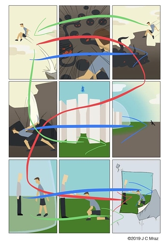 The consistency of the panels kind of works against an action comic like this. It brings down the impact a lot of the sudden/explosive scenes could have if you tried going for a dynamic panel frame that would fit the intensity. Some of the instant action scenes come off a little too sudden as well, like I'm missing a few pictures of what went on in between the moments when the worm suddenly appears. Having more pictures does not necessarily cut the timing of an instant action if your panels have the proper flow.
