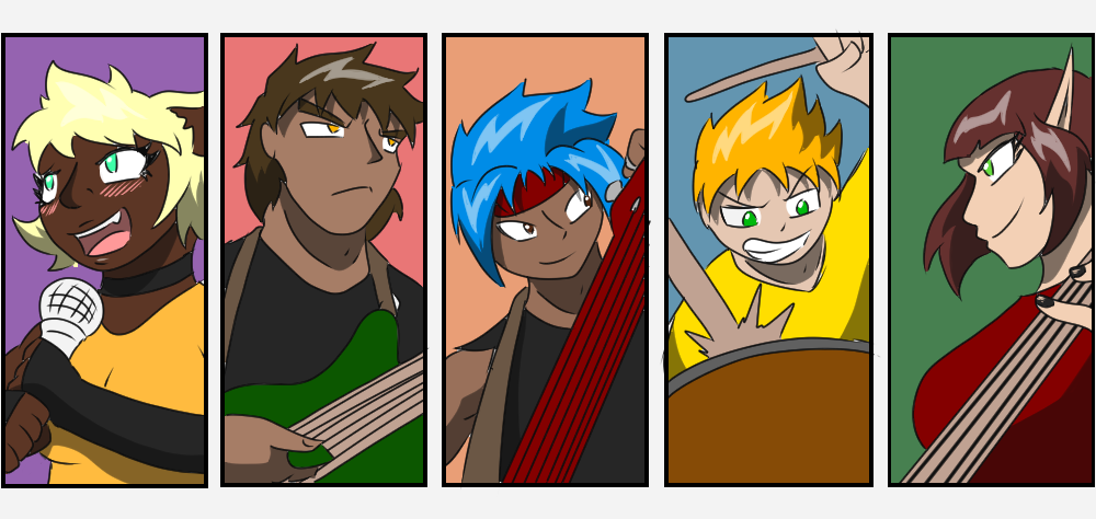 Now I’m thinking my characters should actually form a band XD Crow: Lead Vocals Ellie: Keyboard Luke: Bass (and also manage the band) Artemis: Lead GuitarWren: Drums