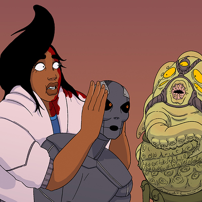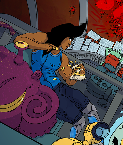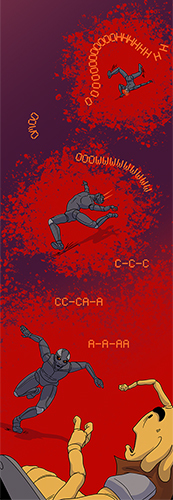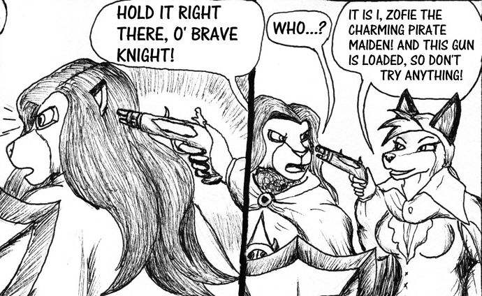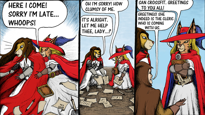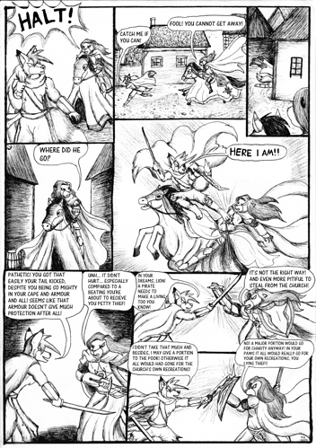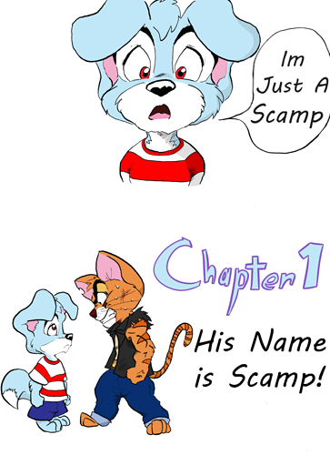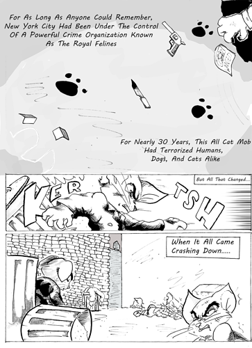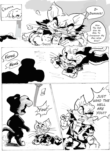 My comic's main character is Scamp Russell and of course he was introduced in the first episode; beating Royal Feline Lieutenant Tabino and his men. You dont actually see him on the first page. You only see Tabino's men lying crippled on the ground or thrown against the garbage cans, leading the reader to wonder who could this person be.